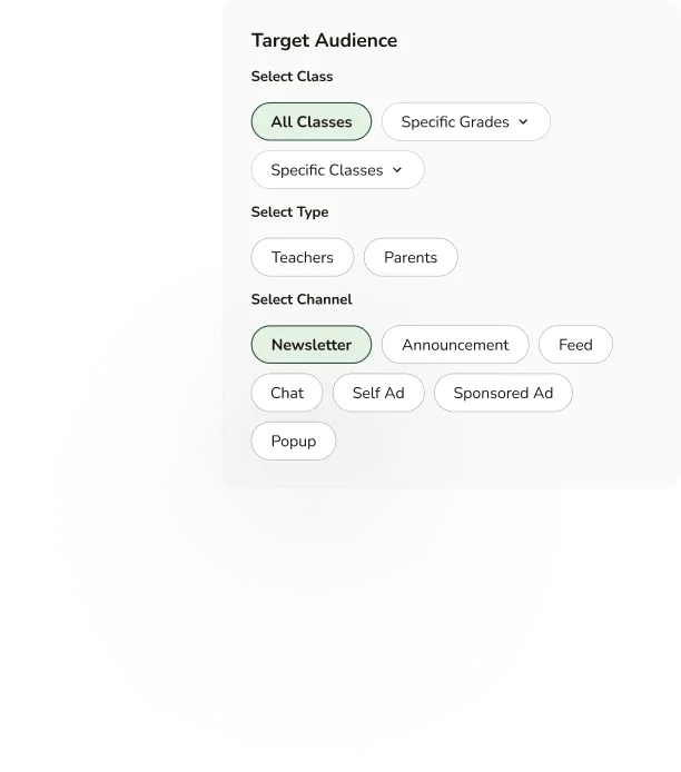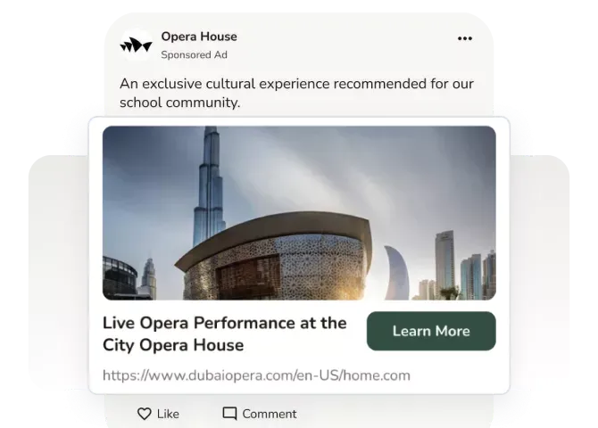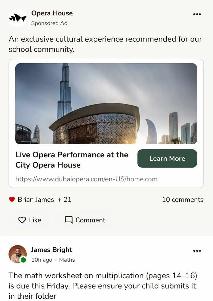Promote school events, extra programmes, and sponsored services with direct in-app visibility. Turn parent attention into action — instantly.