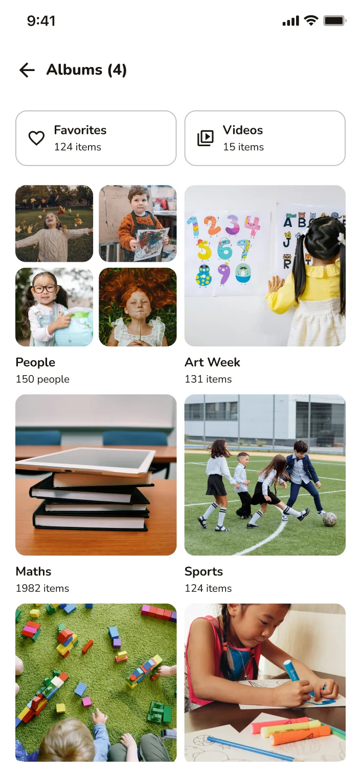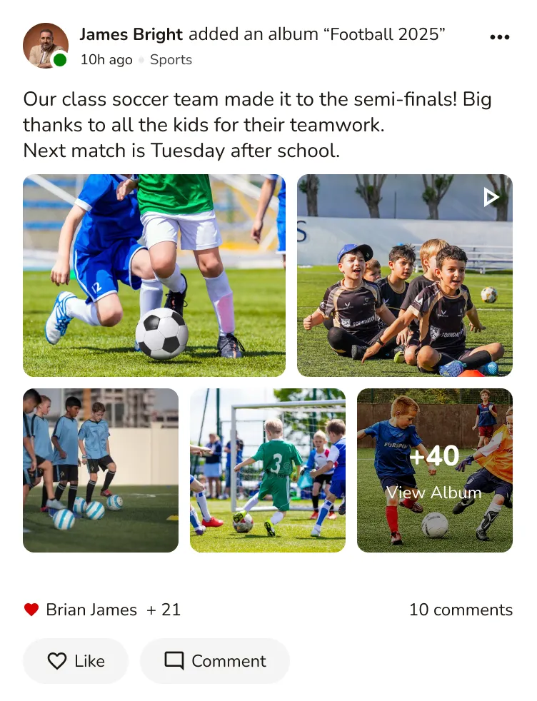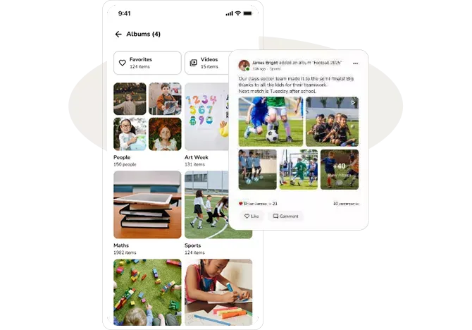Upload once — the platform sorts photos by child, so parents only see their own. School-controlled, admin-reviewed, and privacy-safe.