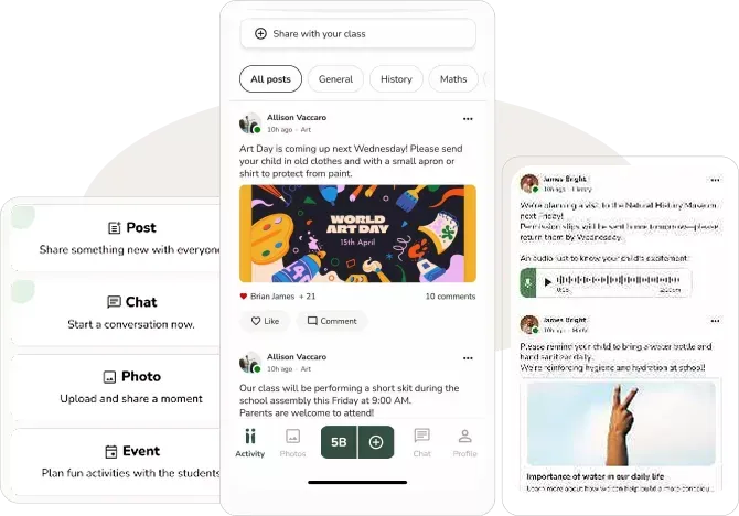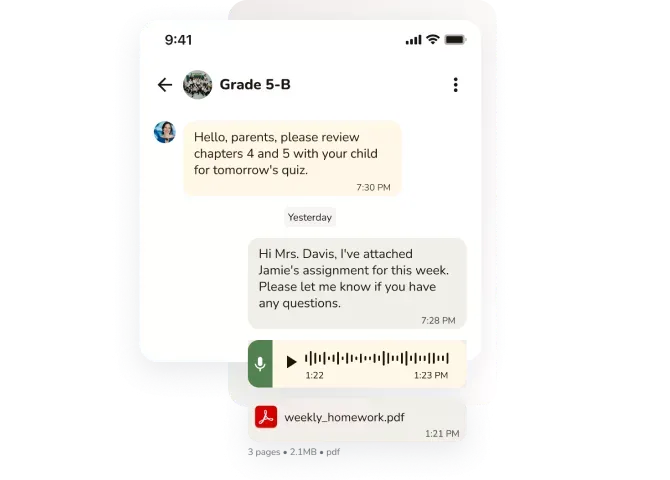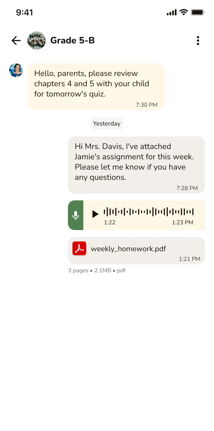 Share activities, homework reminders, and classroom moments in real time — without a personal phone number, without WhatsApp, and in under 3 minutes.